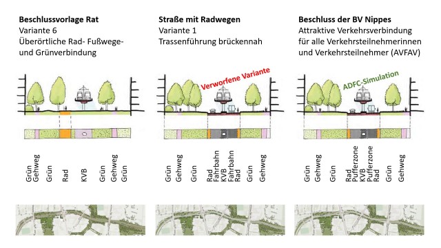 Doch nun ist alles anders. In intensiven Beratungen entstand zu später Stunde eine Vorlage, die in vielen Punkten deutlich über die des Rats hinausgeht, und auf die sich fast alle Bezirksvertreterinnen und -vertreter gestern einigen konnten. Es gelang der Kunstgriff, statt einer Straße mit Geh- und Radwegen eine "attraktive Verkehrsverbindung für ALLE Verkehrsteilnehmerinnen und Verkehrsteilnehmer" (AVFAV) zu schaffen. Insbesondere die Nippeser Radfahrerinnen und Radfahrer dürfen sich freuen: Anstelle eines überbezirklichen 4,50m breiten Radschnellweges nach Vorbild des RS1 im Ruhrgebiet erhalten sie je Fahrtrichtung 2,50m breite rein innerbezirkliche Radwege, die jeweils nördlich und südlich der Bahntrasse verlaufen. Weitere Details sind noch nicht durchgesickert, aber schon jetzt ist klar: Unfälle mit "aufeinander zu rasenden Pedelecs" sind nach den Erläuterungen der Antragsteller durch die räumliche Trennung vollkommen ausgeschlossen. Auch Kollisionen zwischen Fußgängern im Begegnungsverkehr wird man hier nicht beklagen müssen, weil auch diese auf innovativen Ein-Richtungs-Gehwegen mit komfortablen 2,50m pro Laufrichtung geführt werden. So ist auch ein gefahrloses Überholen von langsameren durch schnellere Fußgänger mit ausreichendem Abstand erstmals in Nippes möglich.