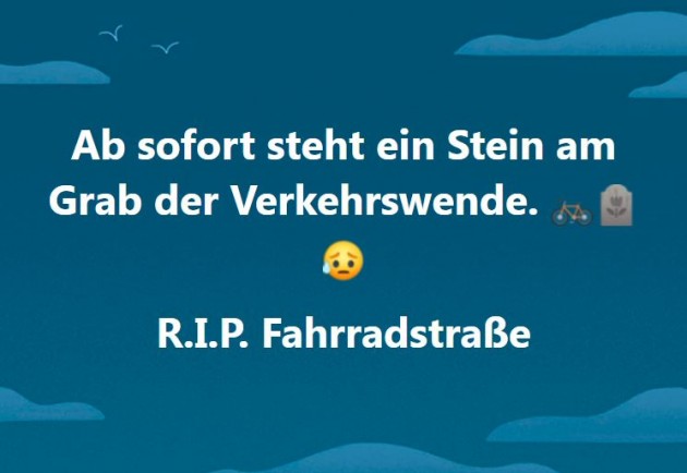Liebe Newsletter-Leser! Guten Tag, vielleicht habt Ihr auch schon die Nachrichten gelesen. Die Laurentiusstraße hat Herr Stein aufgegeben. Mein Herz brach zusammen. Ich dachte ich kann mit der Fahrradstraße endlich mich sicher fühle morgens zur Schule zufahren wenn die Straße neu saniert ist und die Priorität nicht mehr beim Auto liegt sondern beim Fahrradfahrer. Ich finde es traurig dass nur wegen erheblicher Missachtung der Autofahrer das Projekt was zu einer Erweiterung der Innenstadt führen könnte, untergraben wird. Ich weiß echt nicht was ich sagen soll. Lassen Sie sich bitte nicht von populistischen Aussagen der CDU oder FDP vergraulen. Starten Sie eine Aktion oder Petition! Der Entwurf sah so vielversprechend aus. Grünes Viertel, E-Ladestationen, weniger Autoverkehr bedeutet auch bessere Möglichkeiten für den Busverkehr an der Stationsstraße. Bitte ziehen sie durch! Suchen Sie das Gespräch! Demonstration planen oder Aktionen. Wir müssen es schaffen unsere Gründe klar und deutlich zu machen! Bitte. Liebe Grüße, ein verzweifelter Jugendlicher -- Ich glaube, dem ist nichts weiteres hinzuzufügen. Der verzweifelte Jugendliche sprach uns aus dem Herzen. Alles weitere und noch viel mehr in unseren Newsletter Ihr ADFC-Team RheinBerg-Oberberg e.V. |