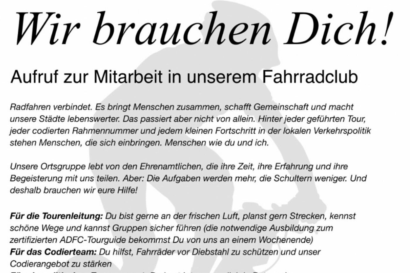 Die Termine in den ADFC-Ortsgruppen findest du wie immer im Touren- und Veranstaltungsportal des ADFC unter dem nachfolgenden Link (hier ist der Kreisverband voreingestellt):