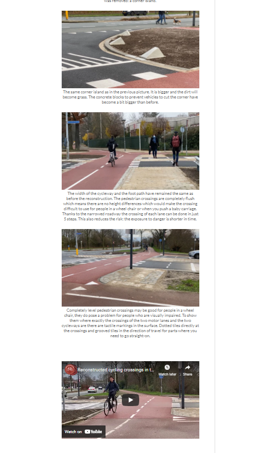 Im Internet gibt es sehr viele Texte und Videos zum Thema Radfahren.Bicycle Dutch ist ein Blog-Kanal von Mark Wagenbuur, der sich mit dem Radfahren in den Niederlanden beschäftigt, fast immer unter dem Aspekt "Verkehrsinfrastruktur". Die Seite ist für alle sehr empfehlenswert, die daran interessiert sind, dass das Radfahren in Deutschland eine größere Rolle spielt. Und für alle, die einfach nur Spaß am Radfahren haben. Marks Seite: https://bicycledutch.wordpress.com/ Er produziert fast jede Woche ein neues und deckt inzwischen praktisch jedes denkbare Thema zum Radfahren ab. Nur zum Spaß habe ich die Themenliste unten eingefügt, ich finde sie wirklich beeindruckend. Den Schwerpunkt legt Mark auf das Radfahren im Alltag. Man kann auch sehr viel lernen, wie sich die Verkehrspolitik in den Niederlanden zu dem Stand entwickelt hat, wie er jetzt ist. Vor allem wir in Deutschland könnten lernen. Zu jedem Thema findet man meist mehrere Beiträge. Sie bestehen jeweils aus einem ausführlichen und fundierten Text mit Bildern, in den ein Video eingebunden ist, das man auch alleine in youtube finden kann.Ich finde die Kombination Text, Bilder und Video sehr gut. Die Videos sind in Englisch, viele sind auch recht lang. Aber wer fundierte Information sucht, findet sie hier. Und wenn man sich z.B. in Chrome den Text gleich übersetzen lässt, ist das Ergebnis ganz ordentlich und man kann dann den Videos auf jeden Fall folgen. Alles in allem eine tolle Seite. Es ist vielleicht ein bisschen unsinnig, es hier einzufügen, aber einfach um die Vielfalt zu zeigen, kommt hier das Themen-Verzeichnis. Viel Spaß beim Stöbern.... Ordinary people cycling In rush hour In the rain In the snow In the dark View from the saddle What makes all this cycling possible: Infrastructure Ordinary cycle infrastructure Cycle lanes Cycle paths/tracks Cycle streets Cycle super highways Floating bus stops Long distance cycle paths Main Cycle Routes Separation (not necessarily with separated cycle infrastructure) Service streets Transitions Width of cycling infrastructure At grade junctions Junction design Left turns Right turn on red Roundabouts Grade-separated crossings Grade-separated roundabouts Overpasses Underpasses Exceptional infrastructure Big bicycle bridges Other infrastructure Bridges Driveways Ferries Motorways (Freeways) Railway stations Road signs Traffic lights Tunnels Maintenance Gritting (clearing surface of snow and ice) Road surface Road works Detours Parking bicycles Cycle parking (at destinations) Residential cycle parking Developments Before and After Filtered Permeability Strict liability Sustainable safety Unbundling/unravelling Why people cycle Commuting/Getting to work OV-Fiets (Bike share) Racing Recreational cycling School Shopping Sports cycling When people cycle Spring Summer Autumn Winter In rush hour In the dark Under what weather conditions people cycle In the rain In the snow Policies that make cycling as transport possible Directness Liveable cities Modal share Road safety Society Stop de Kindermoord Strict liability Sustainable safety Traffic education Training Unbundling/Unravelling modes Urban Planning What led to these policies Advocacy Campaigning Cyclists’ Union; Fietsersbond Fietsstad (Cycling City of the Netherlands-award) Figures Bicycle culture History Before and After Vehicles Bicycles Cargo hopper Ferries Mobility Scooter Mopeds/Scooters OV-Fiets Trucks (Lorries) Where people cycle Areas Beach Country side Heath Hills Industrial area (along the) North sea Woods Places (too many to mention see the map) ’s-Hertogenbosch Utrecht Specific groups in society Children Disabled people Elderly Women This and that Carnival Miffy (Nijntje) NACTO Olympics Queen’s Day (Koninginnedag) Royal Family Small things Some negative aspects Excuses Mopeds/Scooters on the cycle paths NL is not perfect Red light jumping Road rage Restrictions |
